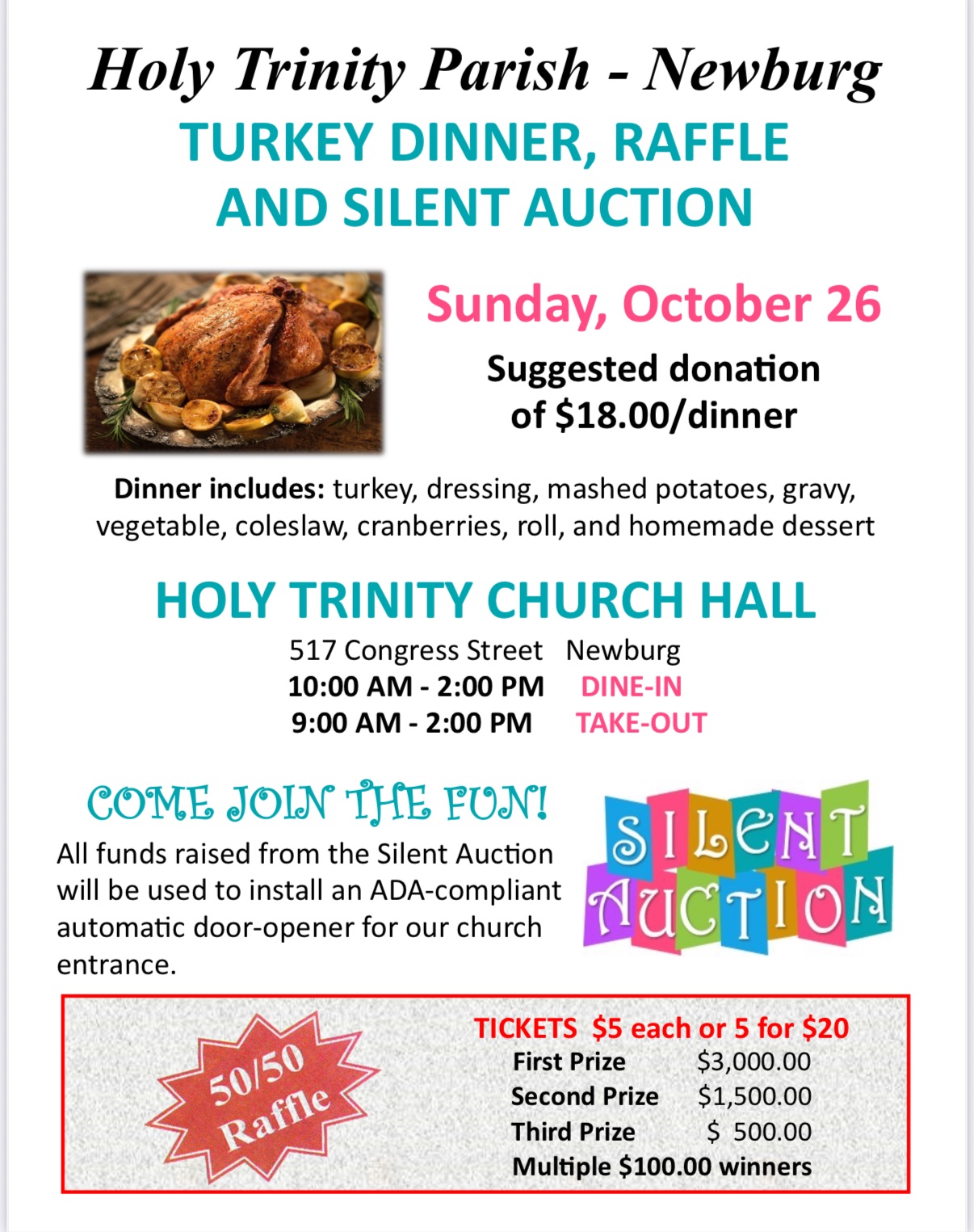 Holy Trinity’s Turkey Dinner, Raffle, & Silent Auction! 𝐅𝐞𝐚𝐬𝐭, 𝐅𝐮𝐧, 𝐅𝐮𝐧𝐝𝐫𝐚i𝐬𝐢𝐧𝐠 Get ready for a delicious meal and a chance to support a great cause! Holy Trinity Parish – Newburg invites you to our annual Turkey Dinner, Raffle, and Silent Auction on Sunday, October 26. + Add to Google Calendar + iCal / Outlook export 00 days 00 hours 00 minutes 00 seconds Date Oct 26 2025 Time 9:00 am - 2:00 pm Share this event